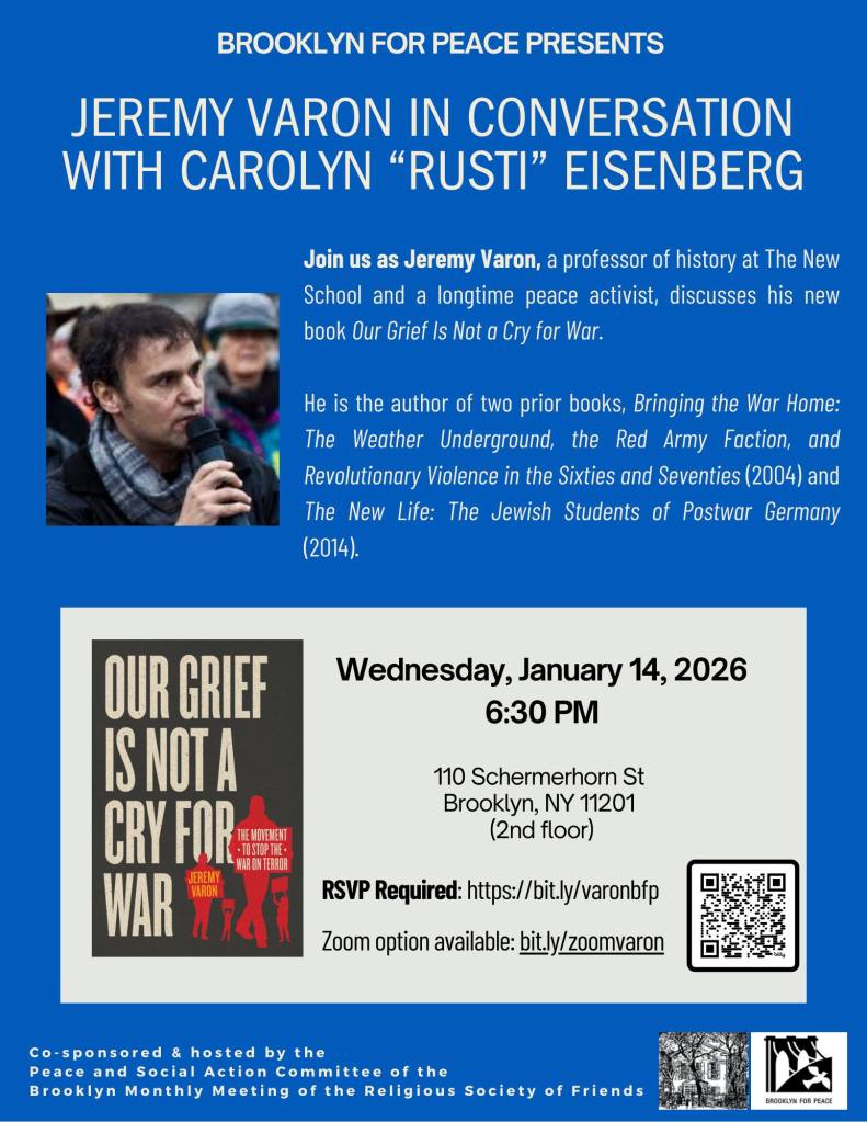 Book Talk with Jeremy Varon and Brooklyn For Peace’s Carolyn “Rusti” Eisenberg.