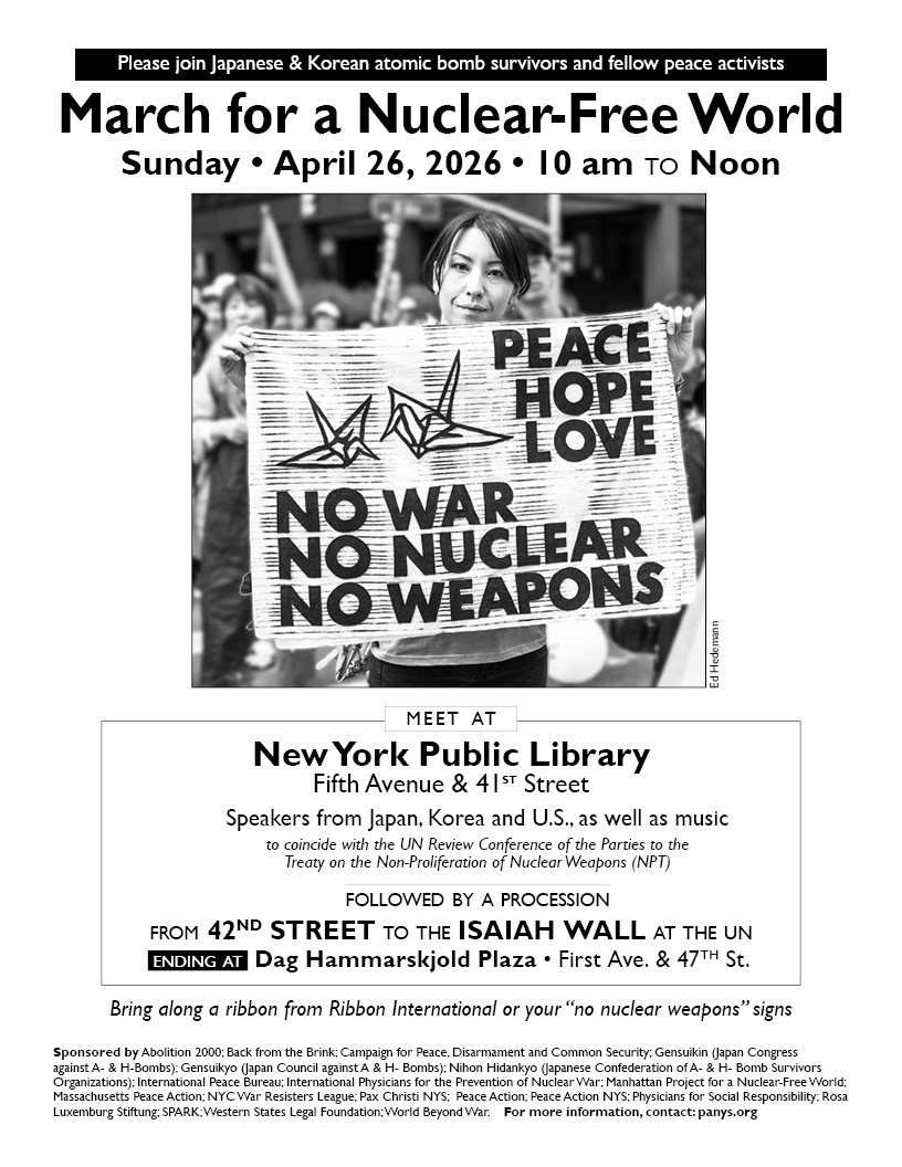 Wednesday, April 29 – 9 – 10 a.m. vigil across from UN as delegates arrive for the Nonproliferation Treat conference, continuing our demand for a nuclear-free world.