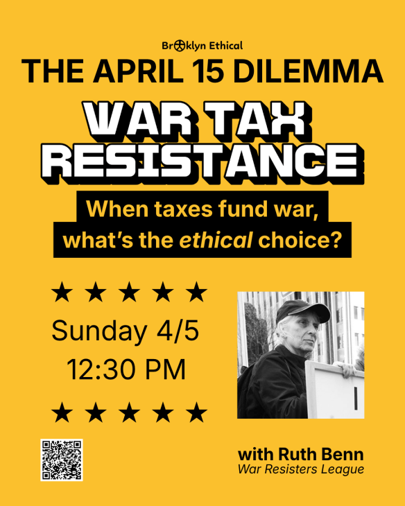 Ruth Benn is speaking at @Brooklyn Ethical on Sunday April 5th, The April 15 Dilemma: War Tax Resistance — a conversation on ethics, accountability, and the choices we face around tax day.